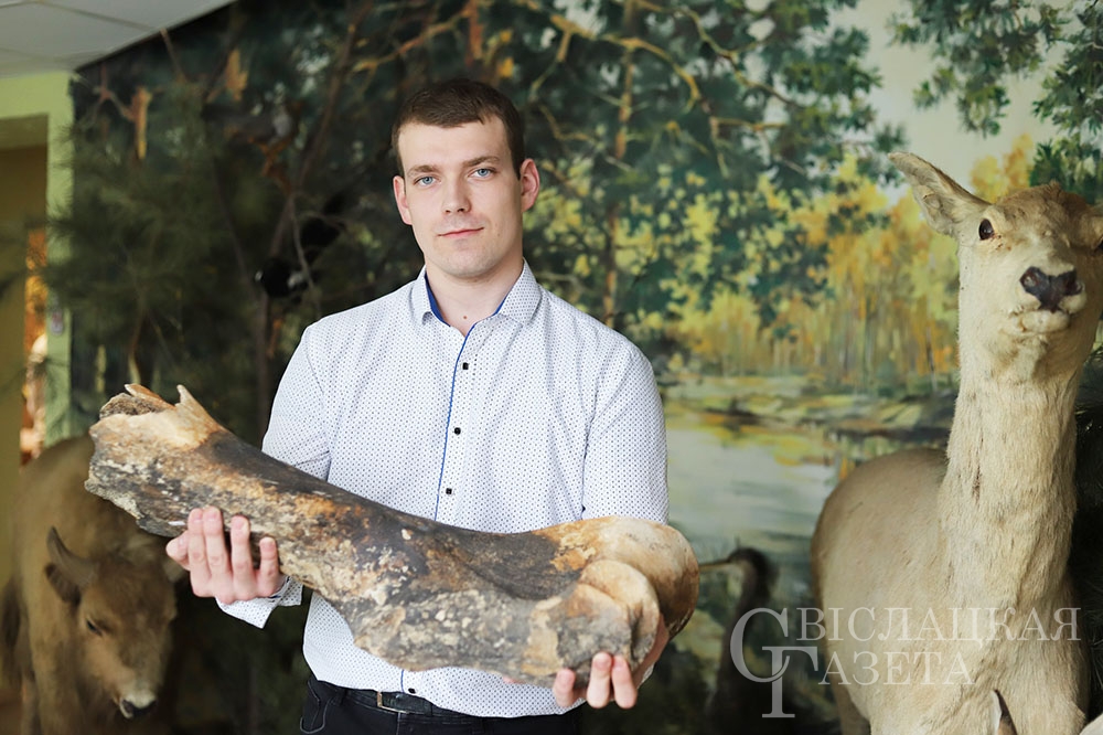 – Экспонат действительно уникален и является очень ценным для музея, – рассказывает старший научный сотрудник Свислочского историко-краеведческого музея Владислав Гурин. – Так как кость оригинальная, а не муляж, ведь зачастую в экспозициях музеев те или иные периоды представлены слепками, моделями. Кость длиной около 70 сантиметров, диаметром около 15 сантиметров и весом более 10 килограммов, которую сегодня может увидеть каждый посетитель районного музея, принадлежит ископаемому животному. Важно и то, что артефакт был найден на территории нашего района (с той позиции, что до 1960 года часть территории нынешней Берестовитчины, в частности, деревни Грицевичи, Клепачи, когда-то была в составе Свислочского района). А озеро, которое сохранило для нас этот экспонат, – искусственный водоем летней резиденции бывшего владельца местечка Свислочь. Да, в 18 веке эти земли принадлежали знаменитому магнатскому роду Тышкевичей. Винцент Тышкевич женился на племяннице последнего короля Речи Посполитой Станислава Понятовского Терезе. Графине приглянулись местные пейзажи. Так в Клепачах, что недалеко от Грицевичей, появилась резиденция свислочских магнатов. Есть свидетельства, что в строительстве принимал участие итальянский граф Калиостро. К сожалению, имение не сохранилось, но осталась зарисовка художника Наполеона Орды, которая хранится в Краковском музее. Болотистая местность дала возможность обустроить здесь и озеро. Расширили его водами протекающей рядом реки Свислочь. Там, на дне водоема, кость и сохранилась. Сохранилась хорошо. Думается, этому поспособствовали илистые отложения. А в начале 90-х сюда пришли экскаваторы… Да, Тышкевичи и не подозревали, что скрывается под толщей воды… Вообще, та местность очень интересная. Там много археологических памятников. Шведская гора так называемая, каменные могилы. На реке Свислочь ближе к нашему райцентру обнаружена и стоянка первобытного человека каменного века, которая внесена в Список историко-культурного наследия района.