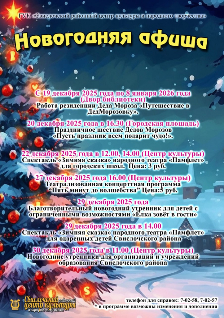 В первые дни января горожан ждет много мероприятий. Центр культуры приглашает на новогоднюю дискотеку 2 января: с 19:00 до 22:00, вход – 2 рубля. Для маленьких свислочан и их родителей покажут спектакль «Зимняя сказка» народного театра «Памфлет». Увидеть театрализованное представление можно будет 3 января в 15:00, цена билета – 3 рубля.