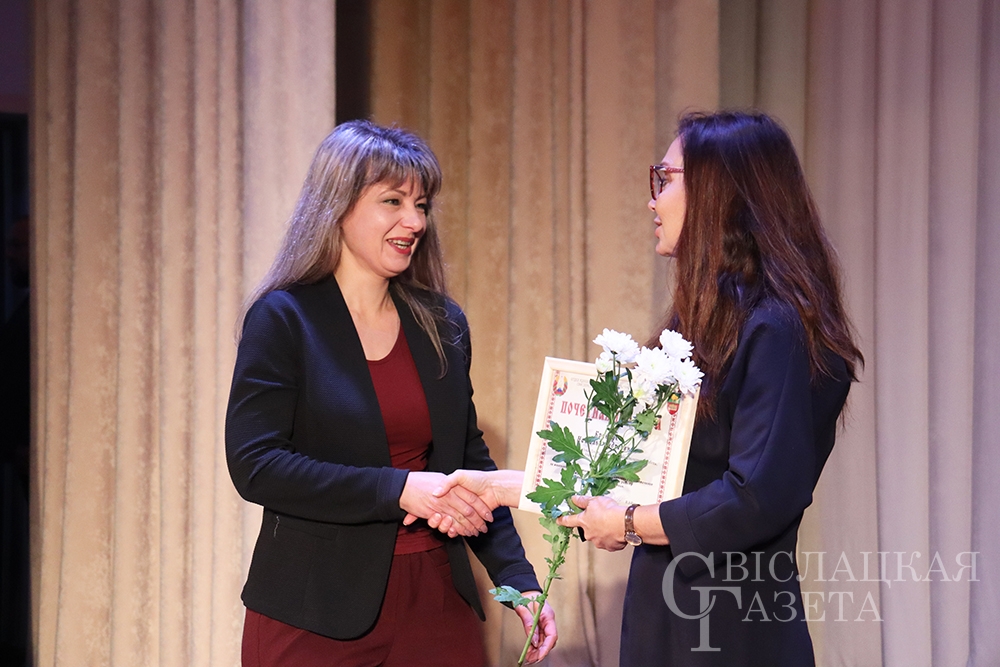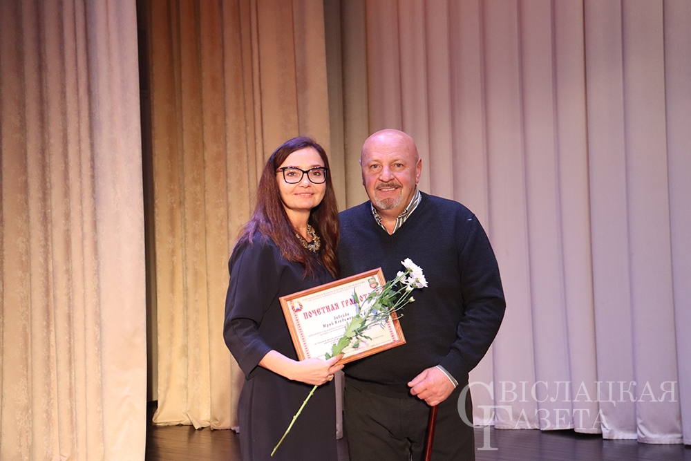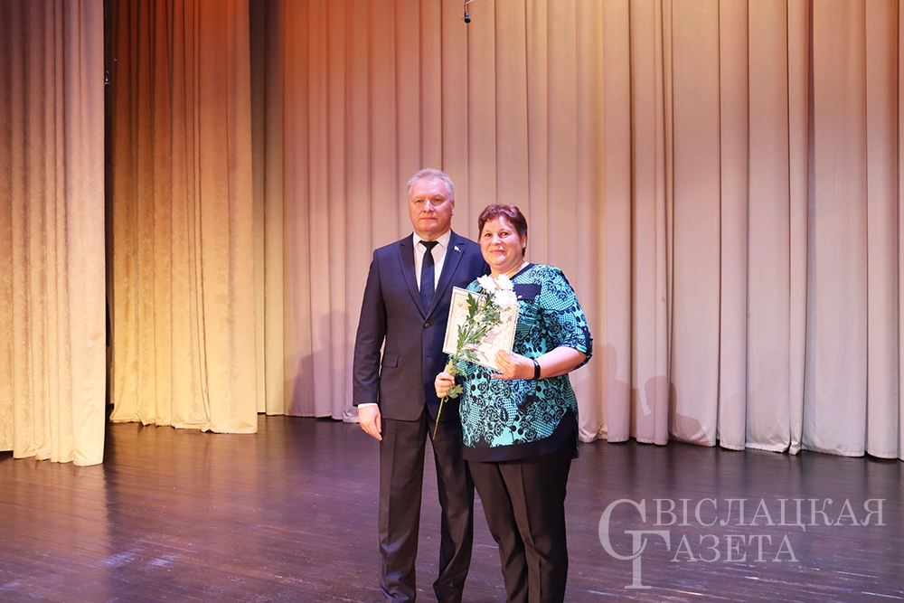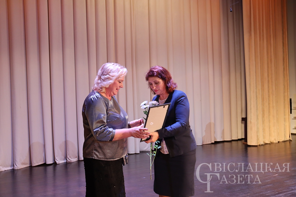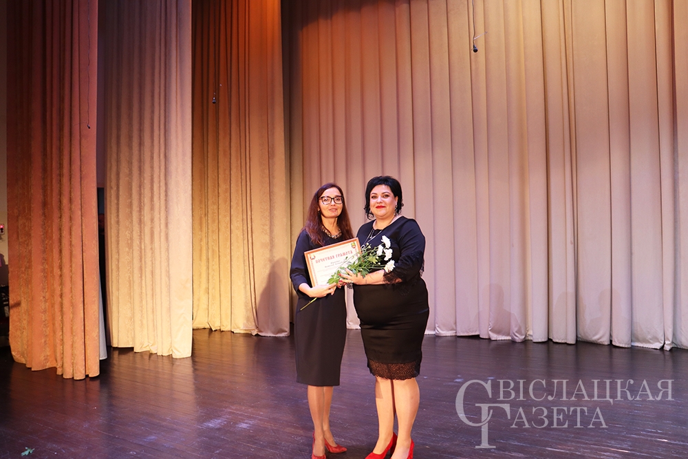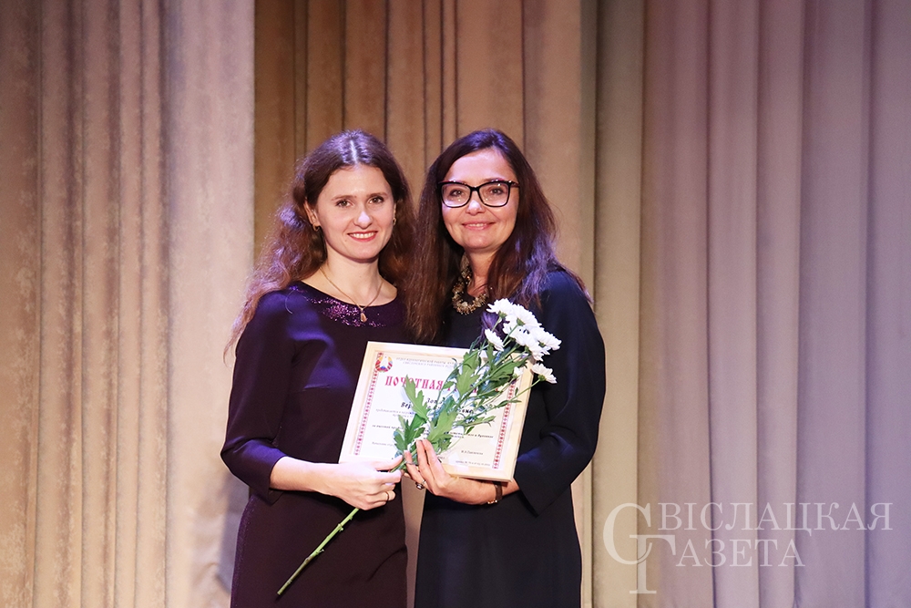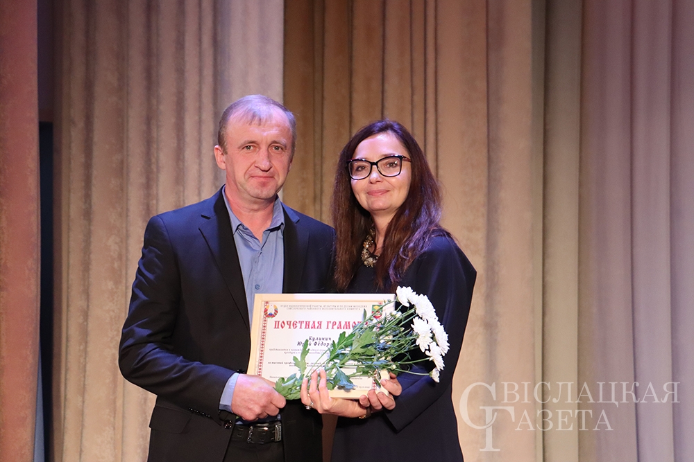 Алена Клімовіч павіншавала работнікаў культуры Свіслаччыны са святам і ўручыла Ганаровую грамату упраўлення культуры Гродзенскага аблвыканкама канцэртмайстру дзіцячай школы мастацтваў Алене Сідаркевіч.