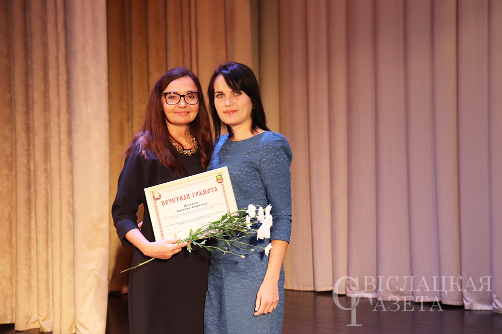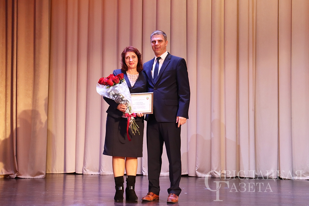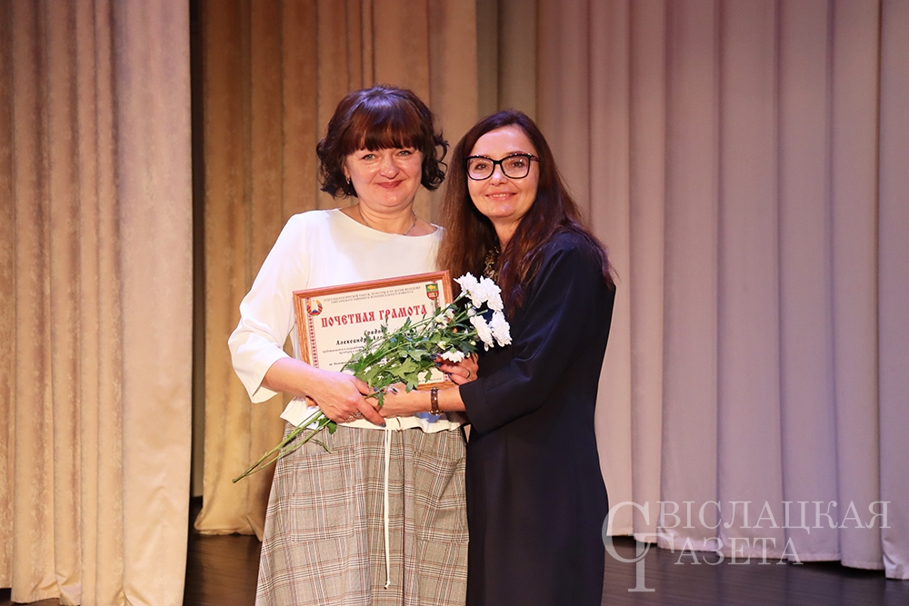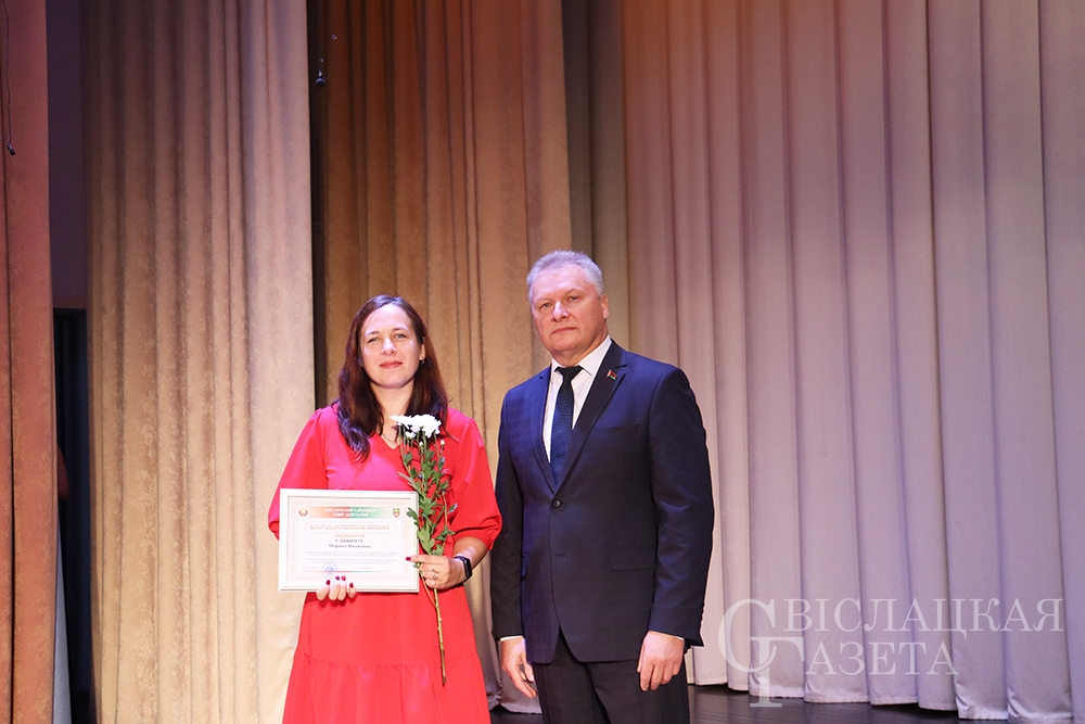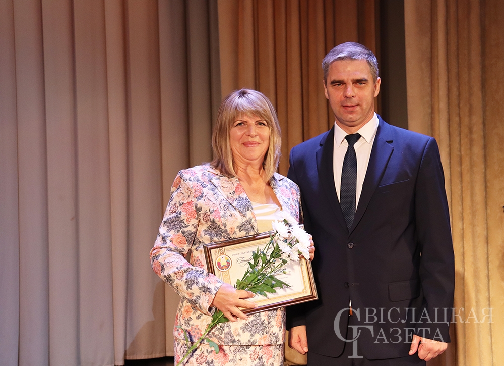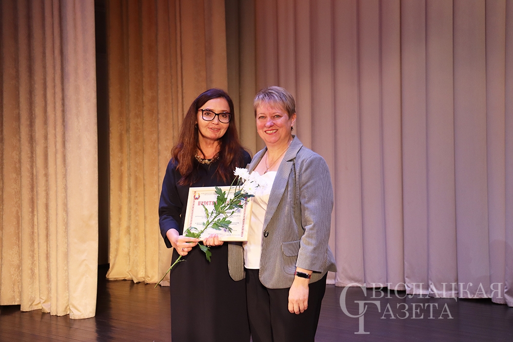 Алена Клімовіч павіншавала работнікаў культуры Свіслаччыны са святам і ўручыла Ганаровую грамату упраўлення культуры Гродзенскага аблвыканкама канцэртмайстру дзіцячай школы мастацтваў Алене Сідаркевіч.