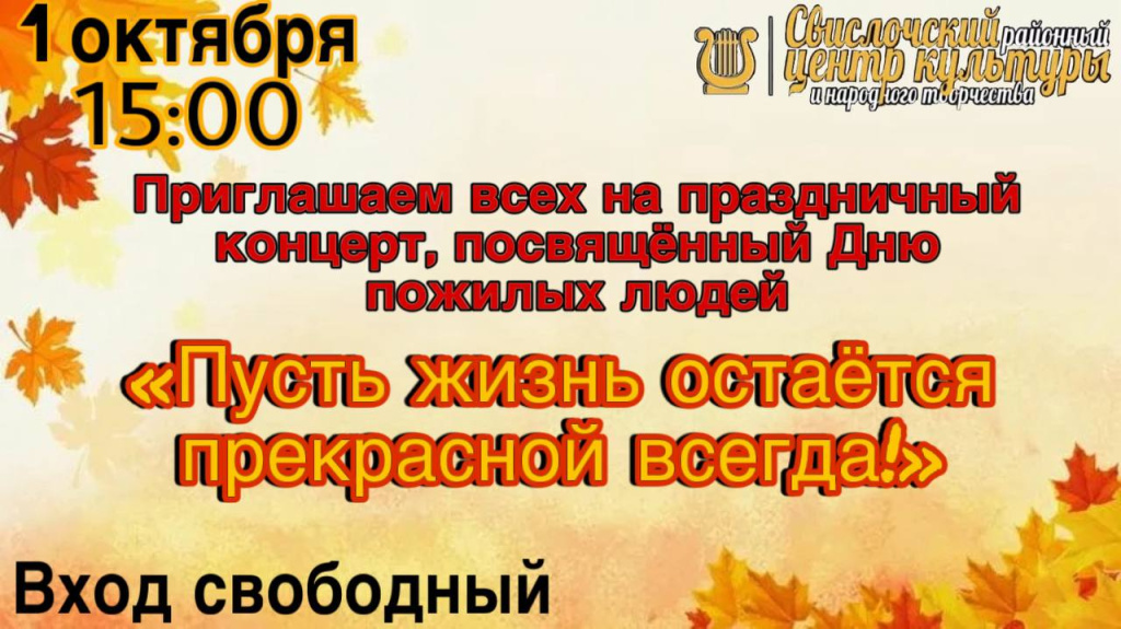 состоится праздничный концерт "Пусть жизнь остается прекрасной всегда!". Мероприятие посвящено Дню пожилых людей.