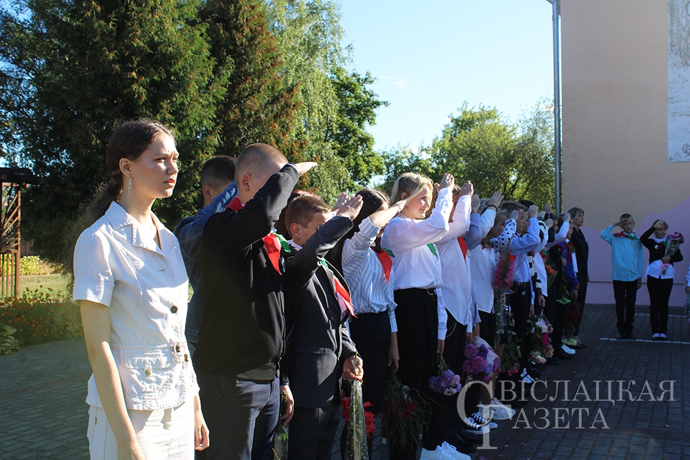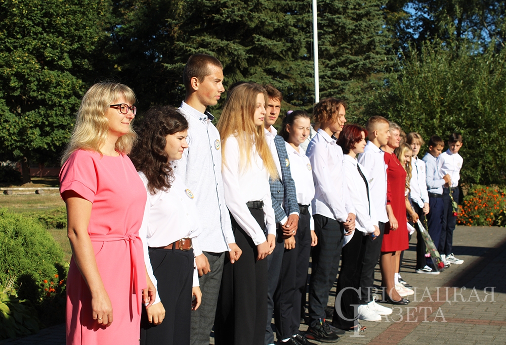 С особой теплотой встретили первоклассников, которых поведет в страну знаний первая учительница Эмилия Савко. Их под бурные аплодисменты присутствующих сопроводили на школьную линейку одиннадцатиклассники со своим классным руководителем Татьяной Гончаревич. Под Государственный гимн Республики Беларусь поднимается Государственный флаг – и торжественная линейка объявляется открытой.