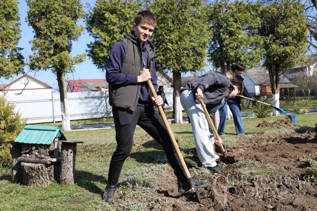 С педагогами вместе трудились и школьники. В этот день они настоящая команда. Девчонки выполняли работу полегче, но не менее ответственную – пропалывали клумбы, подметали мусор, убирали листву. Мальчишки перекапывали почву, возили тележку с сорняками.