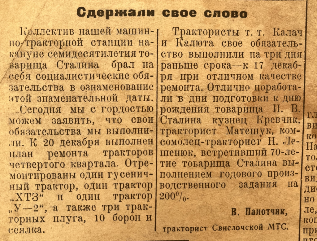 В последнем номере газеты за 1949 год опубликована статья тракториста Свислочской МТС В. Панотчика, в которой передовой работник во всеуслышание заявляет о выполнении обязательства по ремонту тракторов, взятого в честь 70-летия со дня рождения И. В. Сталина.