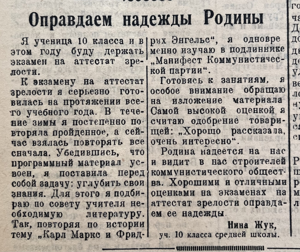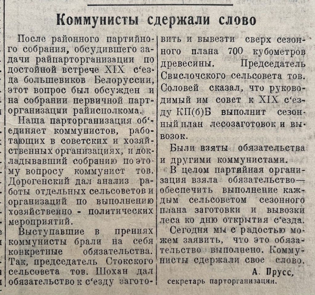 В №13 от 17 февраля в газете «За Родину» (под таким названием в то время она выходила) рассказывается, что в Свислочи прошло районное партийное собрание, на котором обсуждались задачи райпарторганизации по достойной встрече XIX съезда большевиков Беларуси. Этот вопрос был обсужден и на собрании первичной парторганизации райисполкома. Выступающие коммунисты брали на себя конкретные обязательства – выполнить сезонный план лесозаготовок и вывозок. А. Прусс, секретарь парторганизации, в своей статье «Коммунисты сдержали слово» рассказал, что взятое обязательство выполнено.В №33 от 24 апреля учащаяся 10-го класса Свислочской средней школы Нина Жук в статье «Оправдаем надежды Родины» рассказала, как серьезно подходит к экзамену на аттестат зрелости. «Родина надеется на нас и видит в нас строителей коммунистического общества», – пишет ученица.