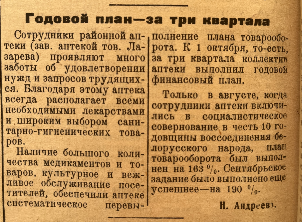 В материале «Годовой план – за три квартала», опубликованный в №80 от 6.10.1949 г. рассказывается о работе районной аптеки. Благодаря умелым действиям руководства аптека снабжена всеми медикаментами, что позволило выполнить годовой финансовый план за три квартала.
