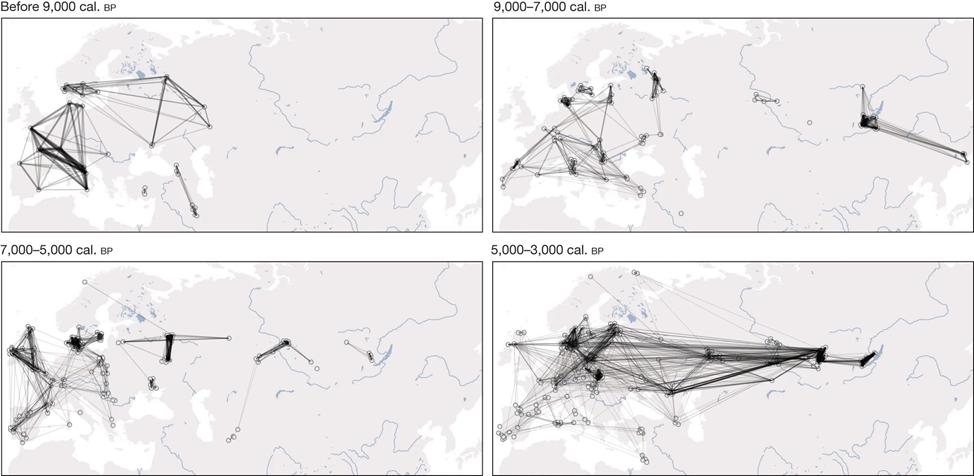 - 10–9 тыс. лет назад: локальные связи, маломобильные сообщества, уже заметен восточно-западный разрыв.