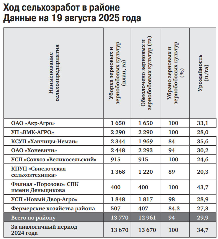 Ход сельхозработ в районе. Данные на 19 августа 2025 года