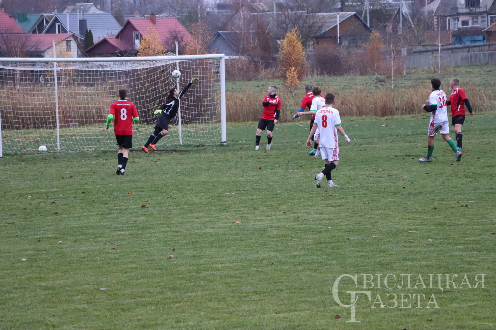 Уже в начале матча болельщики поняли, что игра будет интересной и захватывающей. Сразу на четвертой минуте первого тайма гол со штрафного в ворота соперников забил игрок свислочской команды. Наши футболисты хорошо разыгрались и вскоре еще один гол забили берестовичанам. На перерыв команды ушли со счетом 3:1.