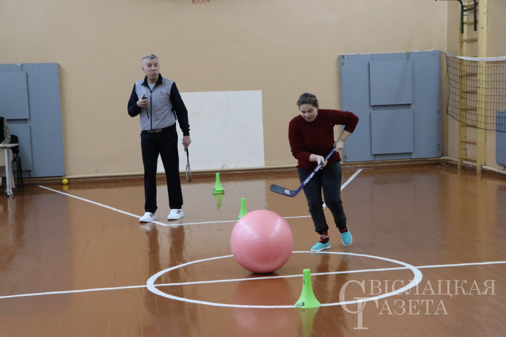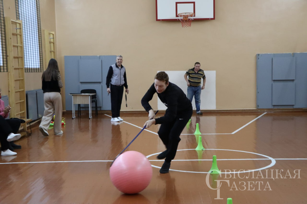 Успешно выполнить здания участникам помогал и поддерживал на всех этапах состязания инструктор-методист Вадим Беляев. Сначала нужно было прогнать клюшкой большой мяч между кеглями. И это только на первый взгляд выглядело легко. Мяч не всегда был послушным, и пришлось приложить немало усилий, чтобы он «бежал» куда следует и возвращался назад. Здесь лучше всех управилась команда Егора Романчука и Дмитрия Брагина. Вторым заданием стало попадание мяча в корзину. И здесь снова первые – Егор и Дима, хотя и другие участники справились хорошо.