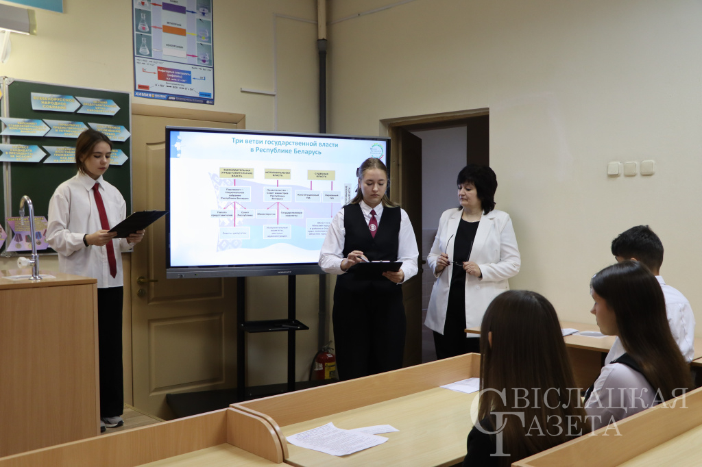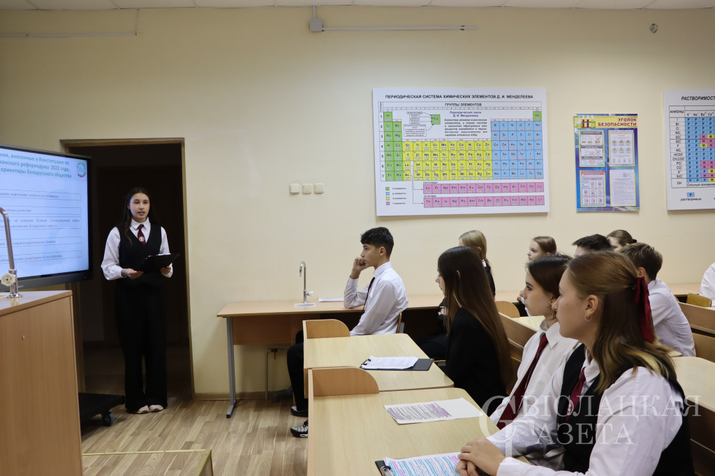 Учитель Ирина Ковальчук вовлекла старшеклассников в серьезный разговор по теме. Ребята обсудили вопросы, касающиеся изменений и дополнений, внесенных в Конституцию по результатам республиканского референдума 2022 года, прав и обязанностей Президента страны, как распределена государственная власть в Беларуси. Не менее интересная тема – за что награждают государственными наградами и премиями в нашей стране.