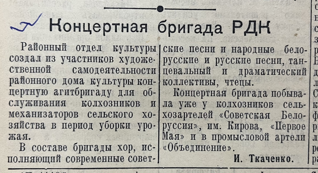 В №63 от 6 августа в материале «Концертная бригада РДК» автор И. Ткаченко рассказывает об инициативе районного отдела культуры по созданию агитбригады, выступающей перед тружениками сельского хозяйства в период уборки урожая.