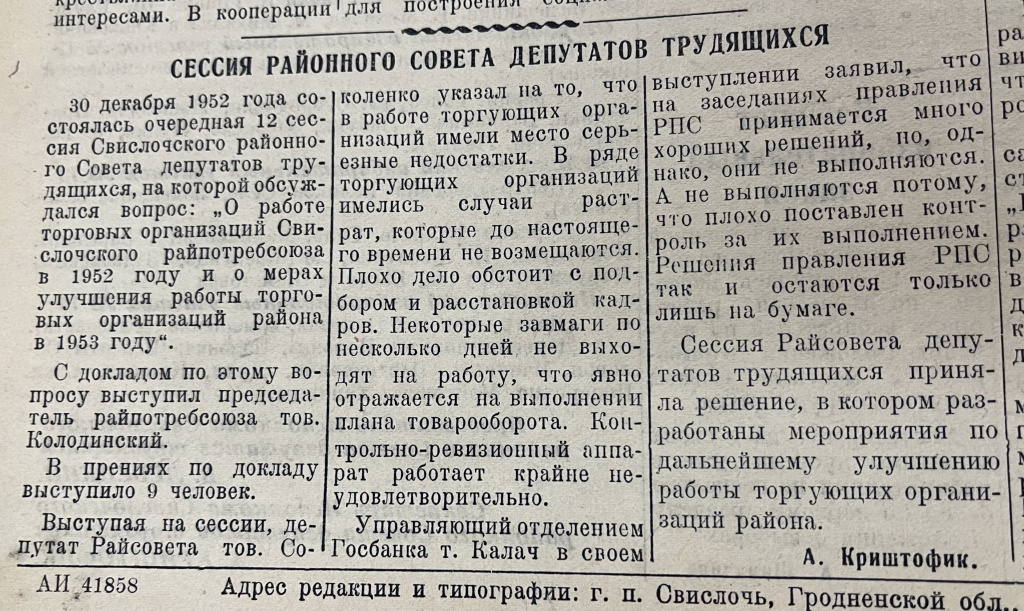 В №2 от 5 января опубликован материал под заголовком «Сессия районного Совета депутатов трудящихся». На сессии рассматривалась работа торговых организаций Свислочского райпотребсоюза. Что ни выступление, то критика в адрес торговли, касающаяся выполнения плана товарооборота, кадрового вопроса, неудовлетворительного контроля за реализацией принимаемых правлением РПС решений.