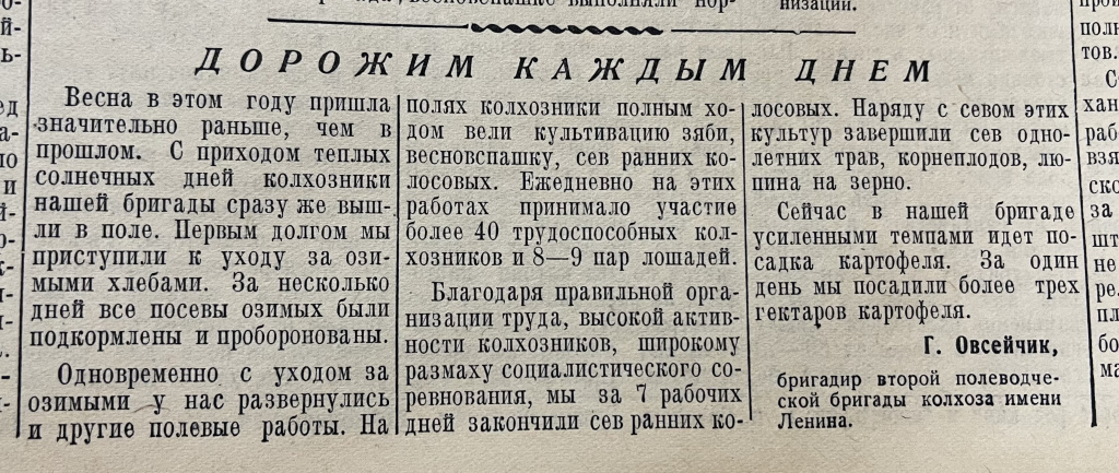 В №35 от 28 апреля опубликована статья бригадира второй полеводческой бригады колхоза имени Ленина Г. Овсейчика «Дорожим каждым днем». В ней – рассказ об успехах тружеников хозяйства на весенне-полевых работах. «На полях колхозники полным ходом вели культивацию зяби, весновспашку, сев ранних колосовых. Ежедневно на этих работах принимало участие более 40 трудоспособных колхозников и 8-9 пар лошадей», – подчеркивает автор.