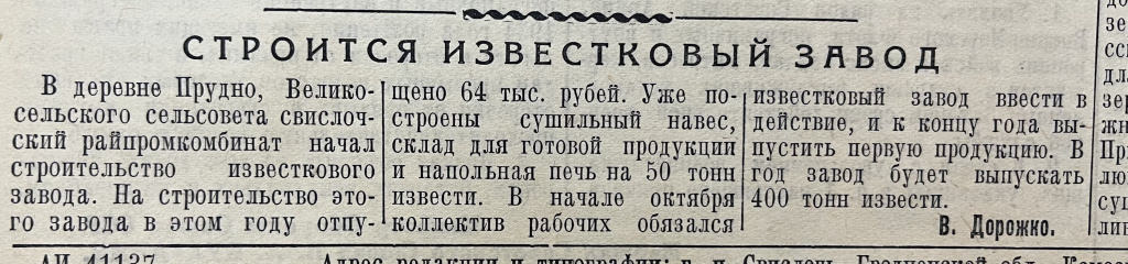 «Строится известковый завод» – под таким заголовком в №73 от 10 сентября опубликована статья за под авторством В. Дорожко. В ней сообщается о том, что в деревне Прудно Великосельского сельсовета Свислочский райпромкомбинат начал строительство известкового завода, планирующего в год выпускать 400 тонн извести.