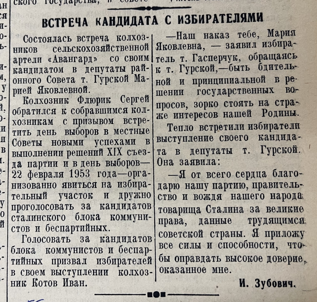 Накануне выборов в местные Советы трудящихся состоялась встреча с кандидатом блока коммунистов и беспартийных Марией Гурской с избирателями – трудящимися колхоза «Авангард», о которой в №11 от 8 февраля на своих страницах рассказала районка. Во время встречи прозвучал призыв – «организованно явиться на избирательный участок», а также дан наказ кандидату в депутаты – «быть бдительной и принципиальной в решении государственных вопросов, зорко стоять на страже интересов нашей Родины».
