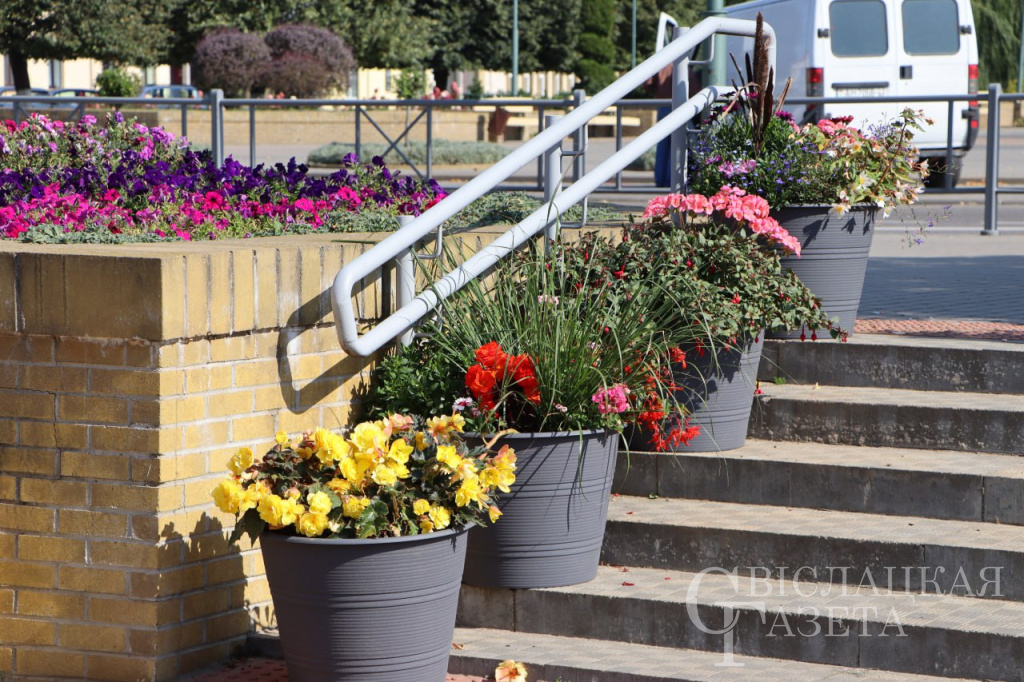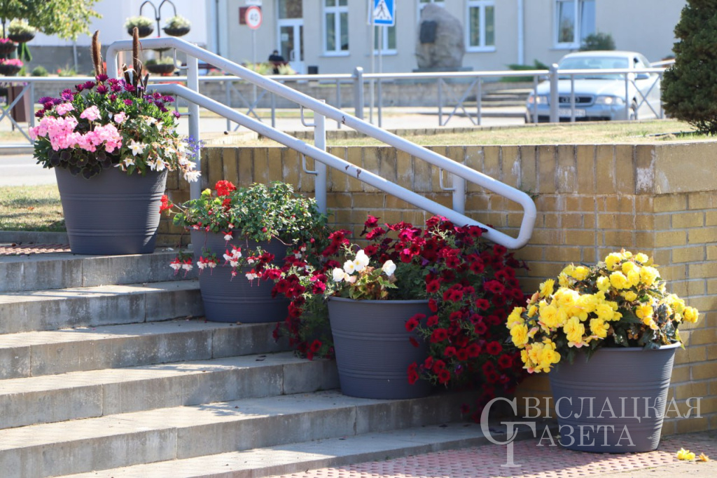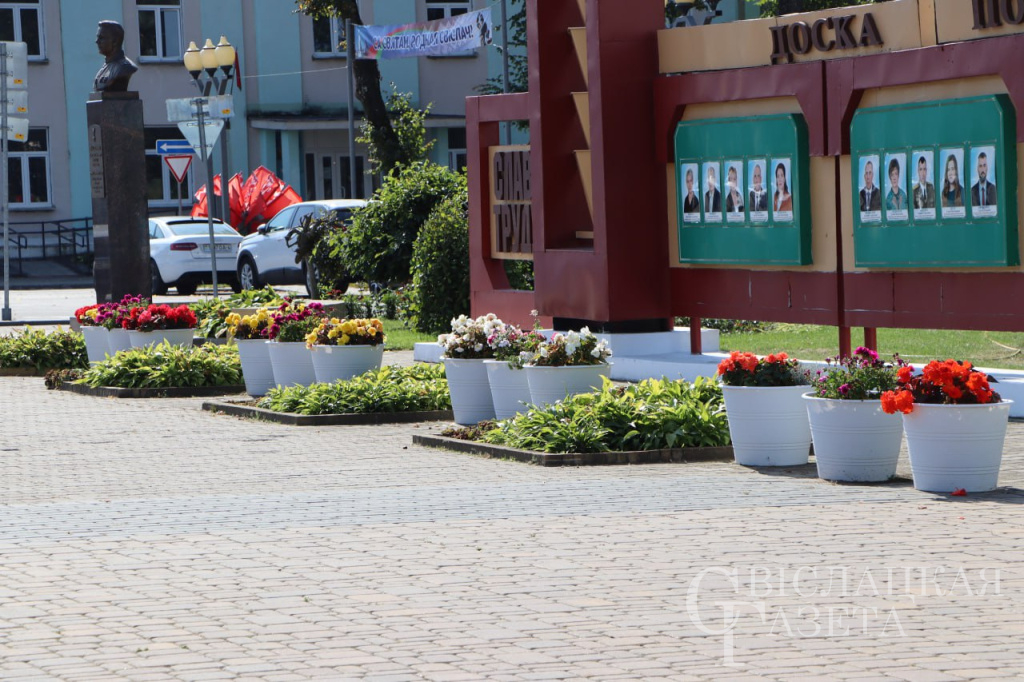 В центре Свислочи напротив здания райисполкома и вдоль районной Доски почета появились большие цветочные горшки. Уверены, что все заметили, что растения в них отчетливее выделяются на фоне остальных клумб.