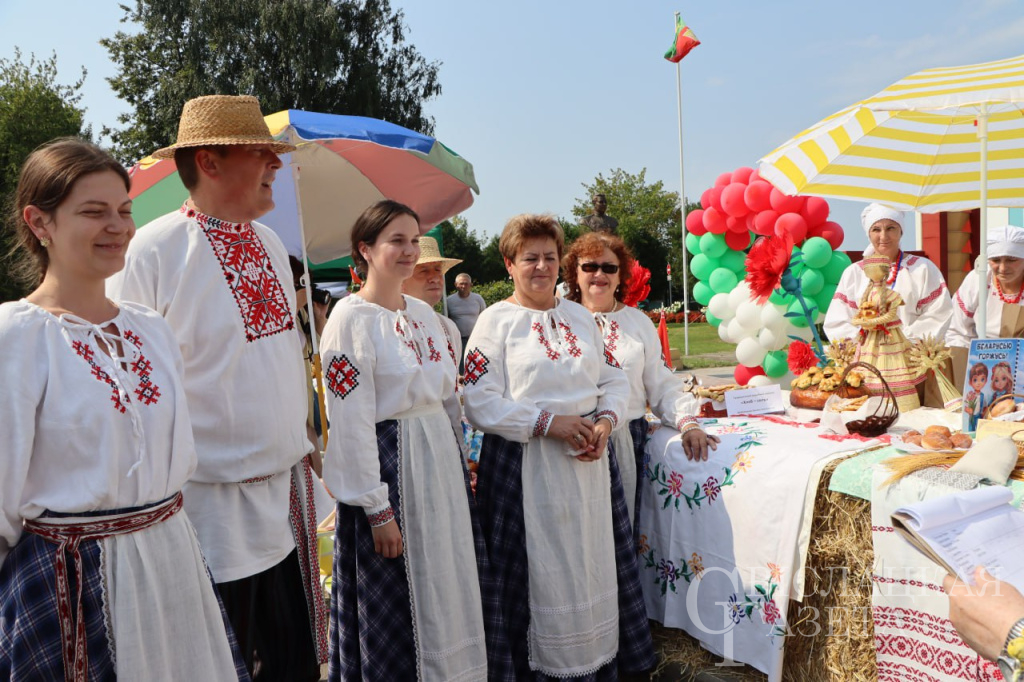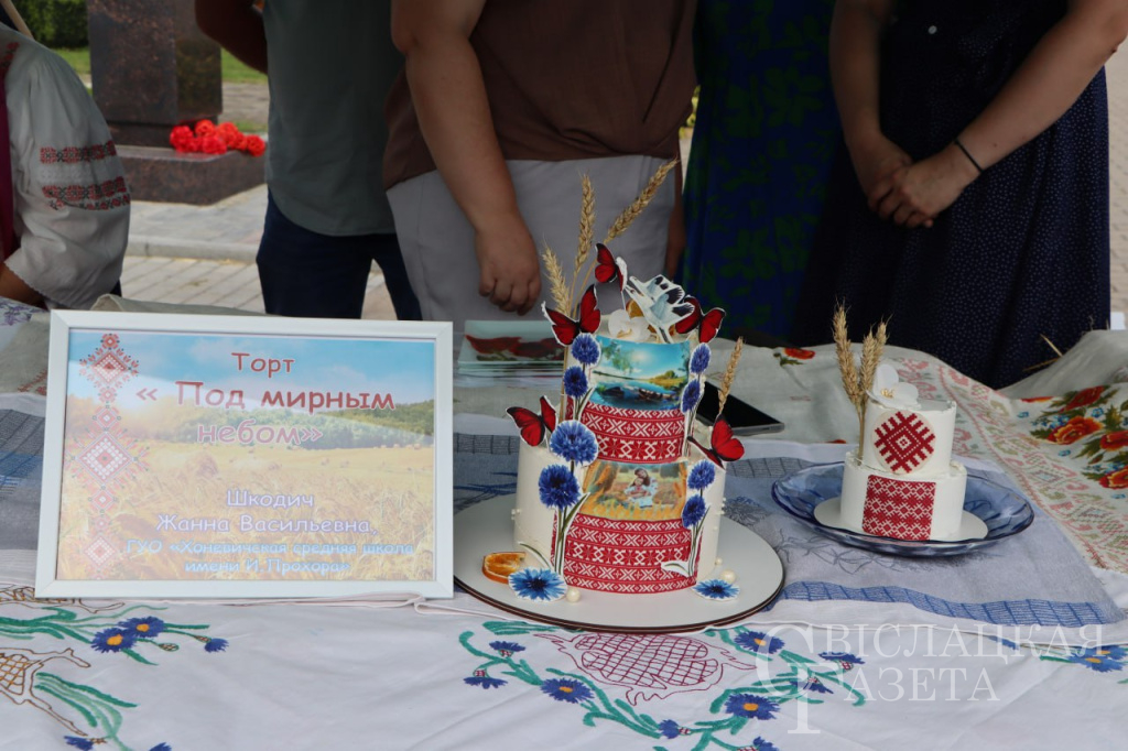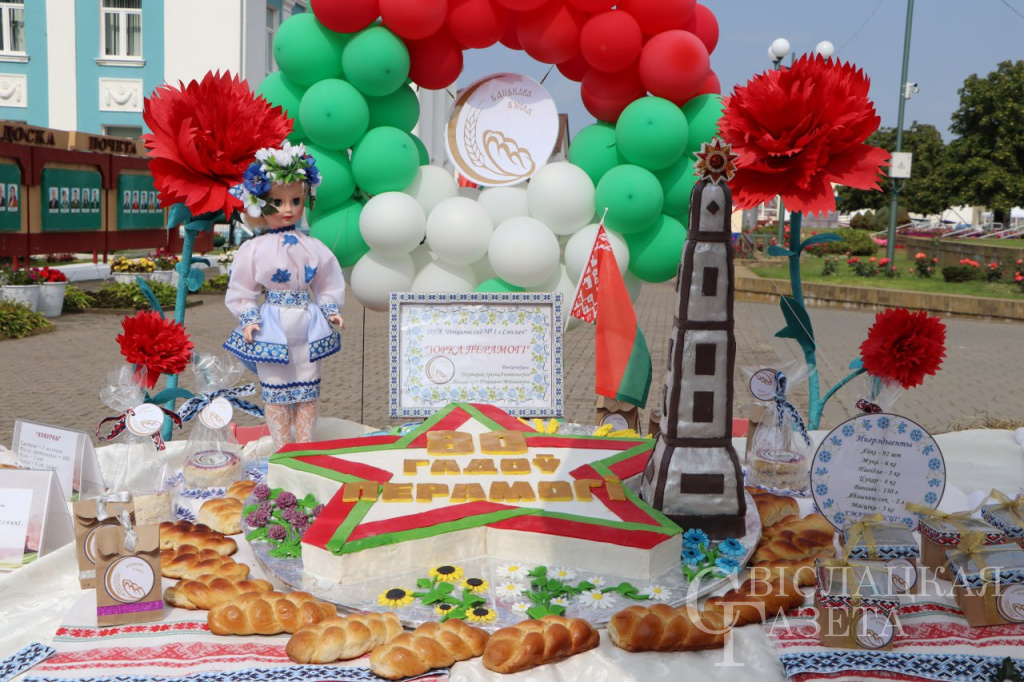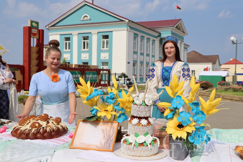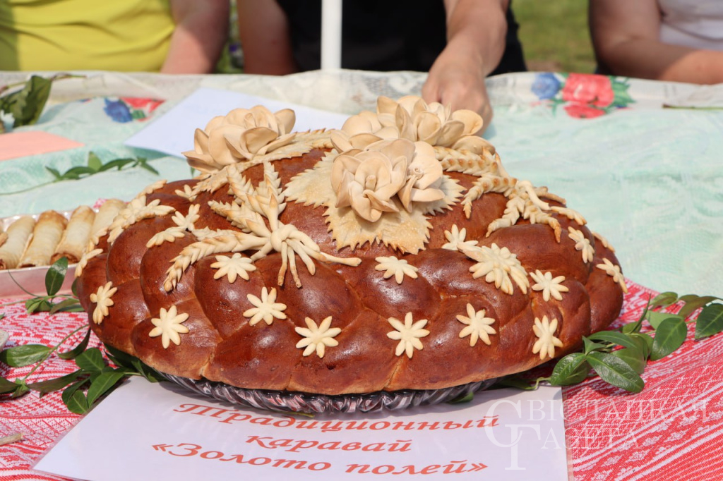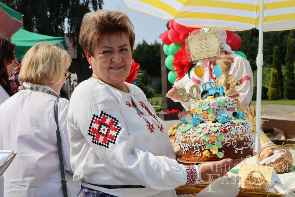 – Каравай оформлен к памятной дате, которую наш народ отметил в этом году, – 80-летию Победы. На нем также элементы, символизирующие любовь к родной белорусской земле, – отметила мастер Татьяна Якубецкая, которая и испекла изделие. – Каравай праздничный, все элементы на нем отображают нашу мирную жизнь.