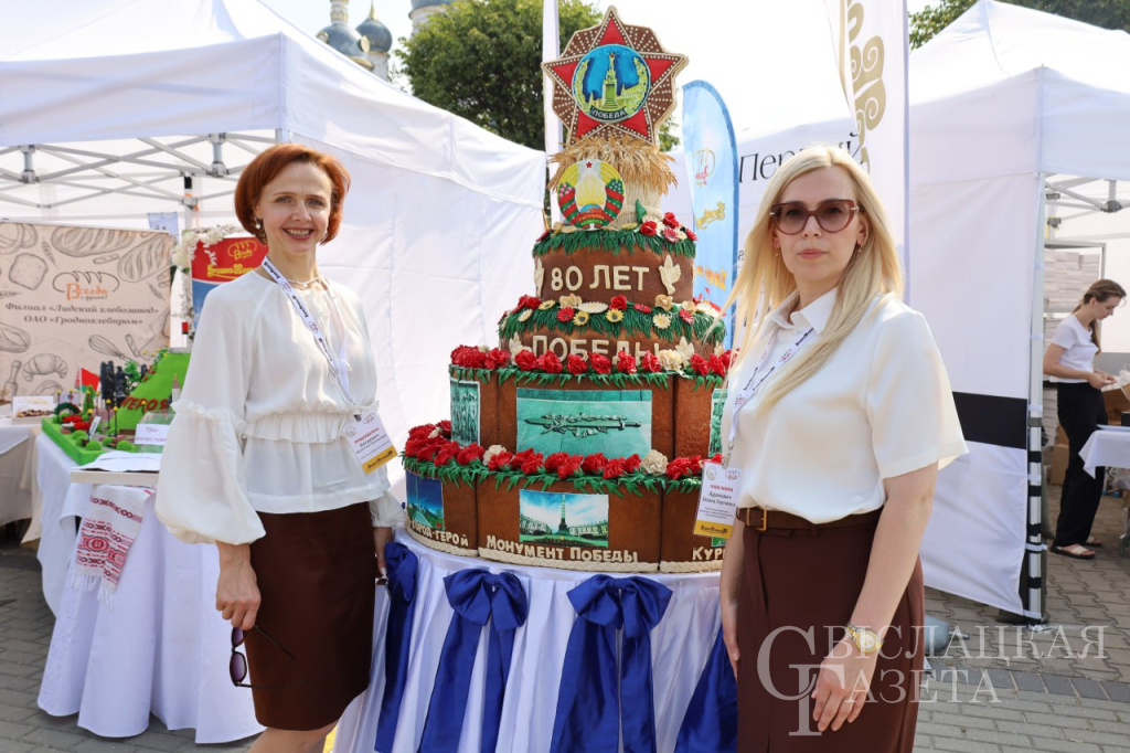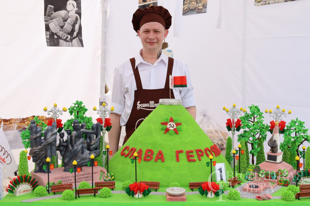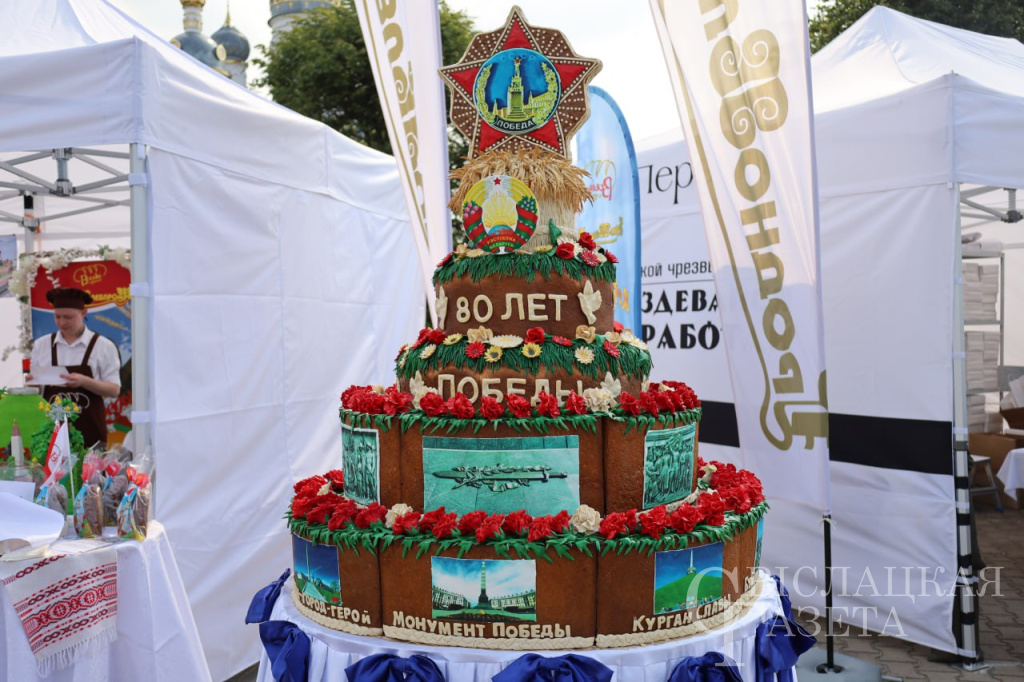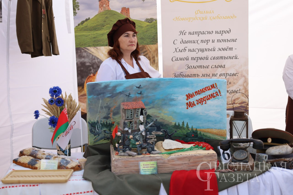 Гроднохлебпром привез на фестиваль самый большой каравай, посвященный теме Великой Отечественной войны. Как рассказала начальник булочного цеха Светлана Потехина, вес пятиярусного изделия – 100 килограммов. На нижнем ярусе хлебопеки отразили наиболее известные мемориальные комплексы и памятники республики, на втором расположился символ Победы – меч, окаймленный лавровой веткой, по бокам – барельефы. Выше размещены голуби, олицетворяющие мирную Беларусь, и хлебный сноп. Венчает изделие Орден Победы. Чтобы украсить каравай, вместо традиционных колосьев и розочек мастера изготовили более ста гвоздик – как символ памяти о погибших в годы войны.