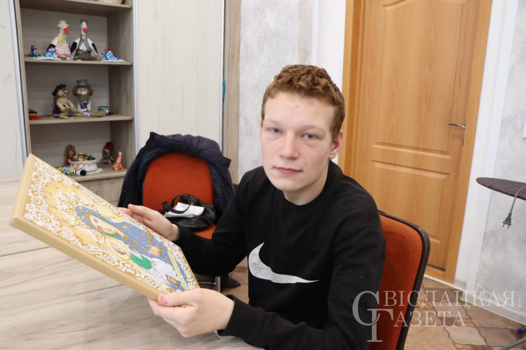 Егорка обучался на дому. Быстро научился читать, считать, писать, а еще с удовольствием посещал кружок «Умелые руки» при Дворчанской БШ. Больше всего Егору нравится работать с алмазными стразами. С их помощью он делает оклады на иконах. Просто удивительно красиво это у него получается.