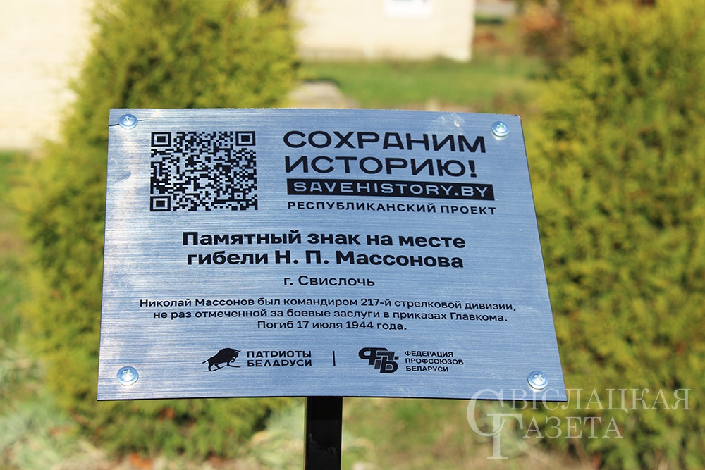 Николай Павлович Массонов, будущий легендарный комдив 217-й стрелковой дивизии, погибший при освобождении Свислочи, родился 117 лет назад, 21 октября 1905 года. О его жизни и боевом пути напомнили присутствующим школьники. Теперь о героическом прошлом героя сможет узнать любой желающий в один клик. Для этого нужно только отсканировать QR-код, размещенный на табличке, с помощью смартфона.