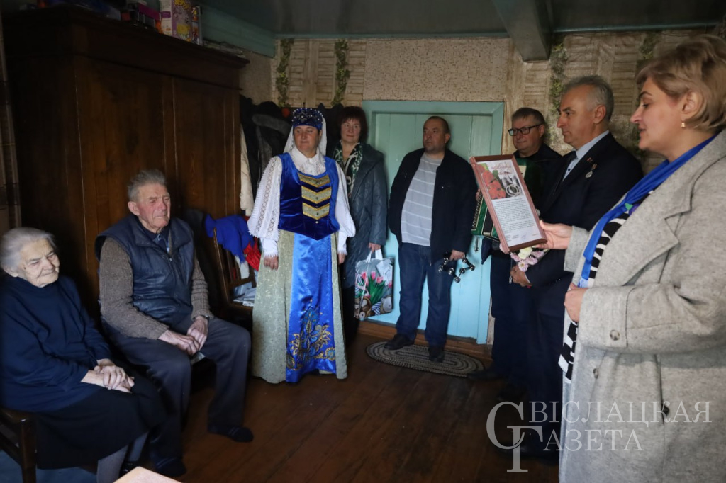 Начальник отдела ЗАГС райисполкома Татьяна Супрун зачитывала юбилярам Приветственный адрес от Свислочского райисполкома, вручала подарки от общественного объединения «Белорусский союз женщин». Добрые слова звучали в адрес супругов от председателей сельских Советов, представителя районного профсоюза АПК. А артисты свислочского центра культуры и народного творчества дарили юбилярам песни.