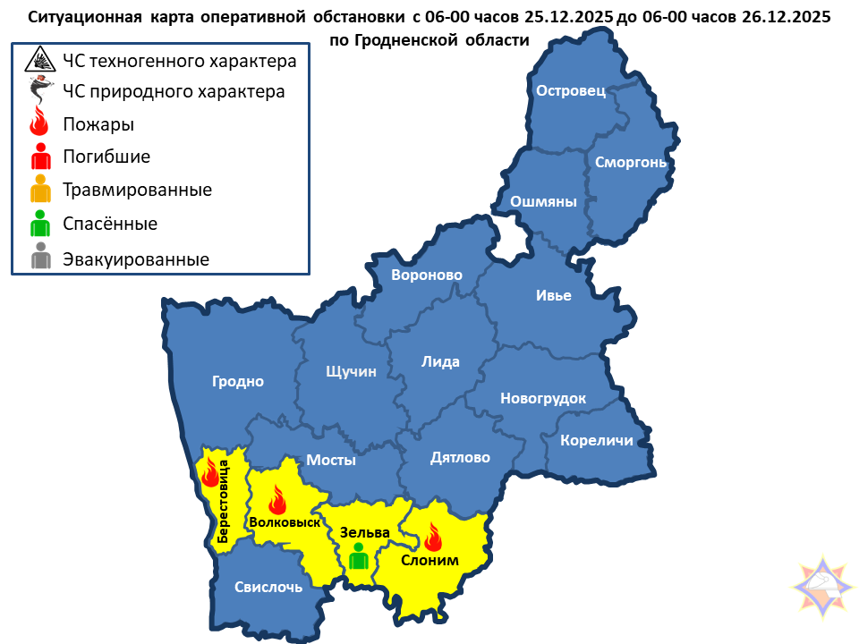 Слонимский район – пожар жилого дома, Берестовицкий район – пожар хозяйственной постройки, г. Волковыск – пожар гаража. При ДТП в Зельвенском районе спасен 1 человек.