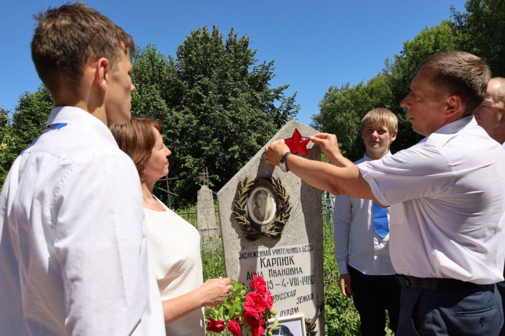 Анна Ивановна Карпюк родилась в 1913 году на Волковыщине. Во время войны была связной партизанского отряда. Устроившись на работу в железнодорожные мастерские на станции Валилы, добывала ценные сведения о движении поездов по направлению Белосток-Волковыск, не раз рискуя своей жизнью. В 1945 году была направлена завучем в тогда только открытую Полонковскую школу. В 1958 году стала ее директором. Преподавала белорусский язык и литературу. Свободно владела польским и французским. Имела диплом магистра права. В 1960 году Анне Ивановне было присвоено звание «Заслуженный учитель БССР». Ее безупречный труд отмечен рядом высоких наград. Школа была ее домом и семьей. Своей она так и не обзавелась. Не стало учительницы в 1980 году, 45 лет назад. Кому ходить по тропинке к ее могиле? Ответ на этот вопрос сегодня есть. Отныне шефство над ней взяла школа. Это не только дань уважения героям, но и способ сохранить историческую память.