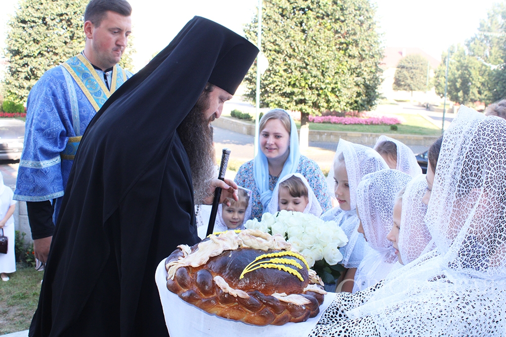 В воскресный день около храма Рождества Пресвятой Богородицы было оживленно, торжественно и очень красиво. Дорожка к храму устлана яркими цветами, по сторонам нарядные прихожане в одежде светлых тонов, в руках с небольшими ароматными пучками, в которых переплелись душистые травы и цветы, воспитанницы воскресной школы в нежных кружевных платочках с красивым букетом белых роз, пышным караваем, яркими шарами. Все говорило о величии Богородичного праздника. Собравшиеся с радостным настроением ожидали архиепископа Антония, о прибытии которого вскоре возвестил колокольный звон.
