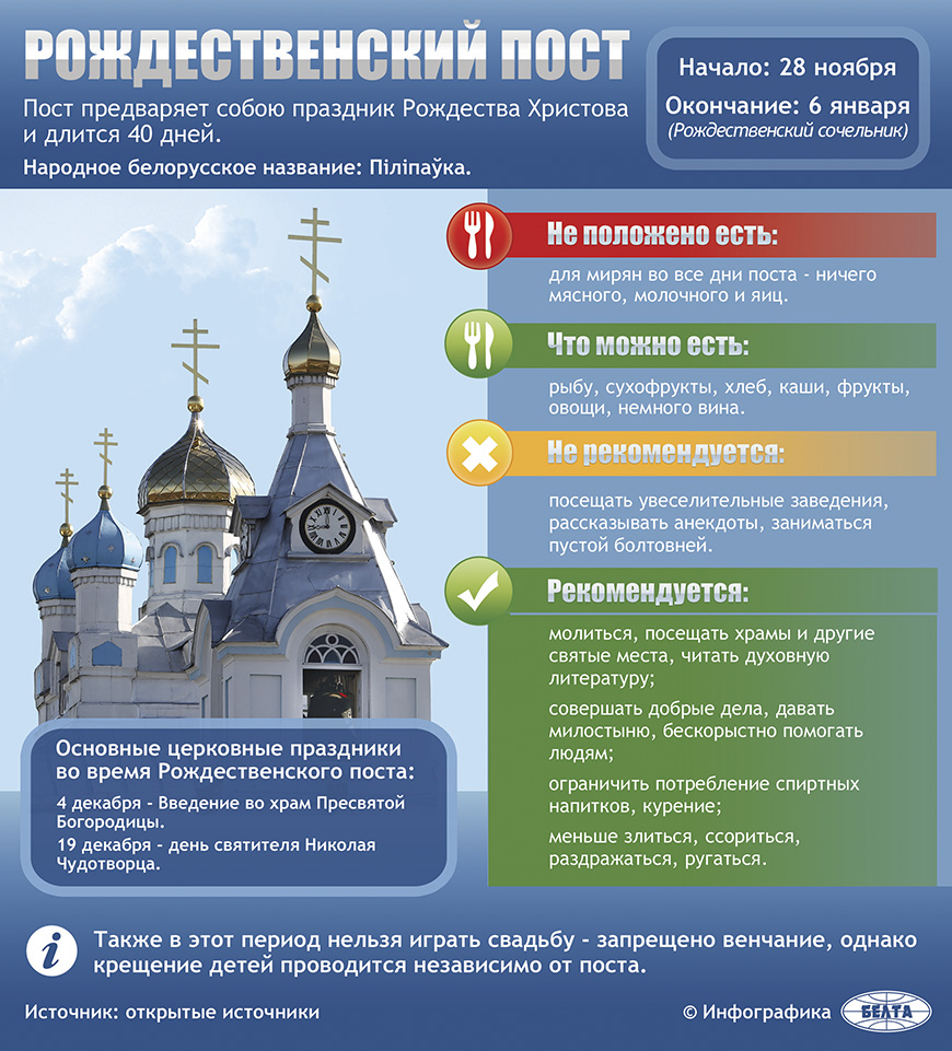 Пост предваряет собою праздник Рождества Христова и длится 40 дней.