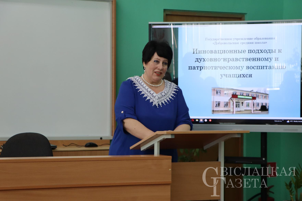 Опытом подходов обучения к духовно-нравственному и патриотическому воспитанию поделилась руководитель областного центра эффективных педагогических практик Добровольской СШ Ирина Янушкевич. Она акцентировала внимание на участии школьников и педагогов в тематических проектах, на активной работе по изучению и воссозданию истории православия на территории района, также на участии ребят в интерактивных мероприятиях по изучению религиозной архитектуры.