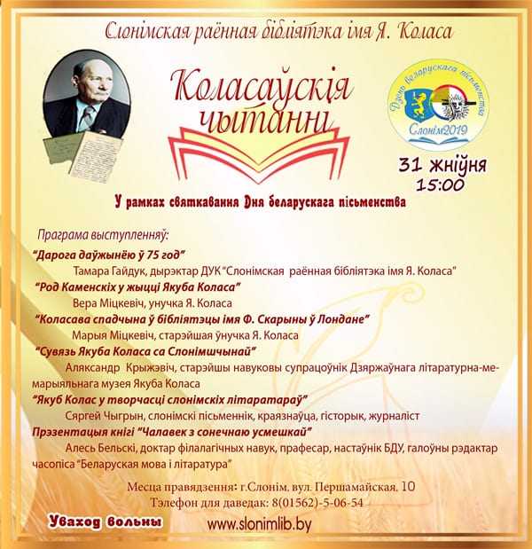 Ужо 31 жніўня Слонімская раённая бібліятэка імя Я.Коласа запрашае на Коласаўскія чытанні, якія адбудуцца з удзелам навукоўцаў, гісторыкаў, краязнаўцаў і пісьменнікаў. Сярод ганаровых гасцей мерапрыемства – унучкі народнага паэта Беларусі Якуба Коласа – Марыя і Вера Міцкевіч.