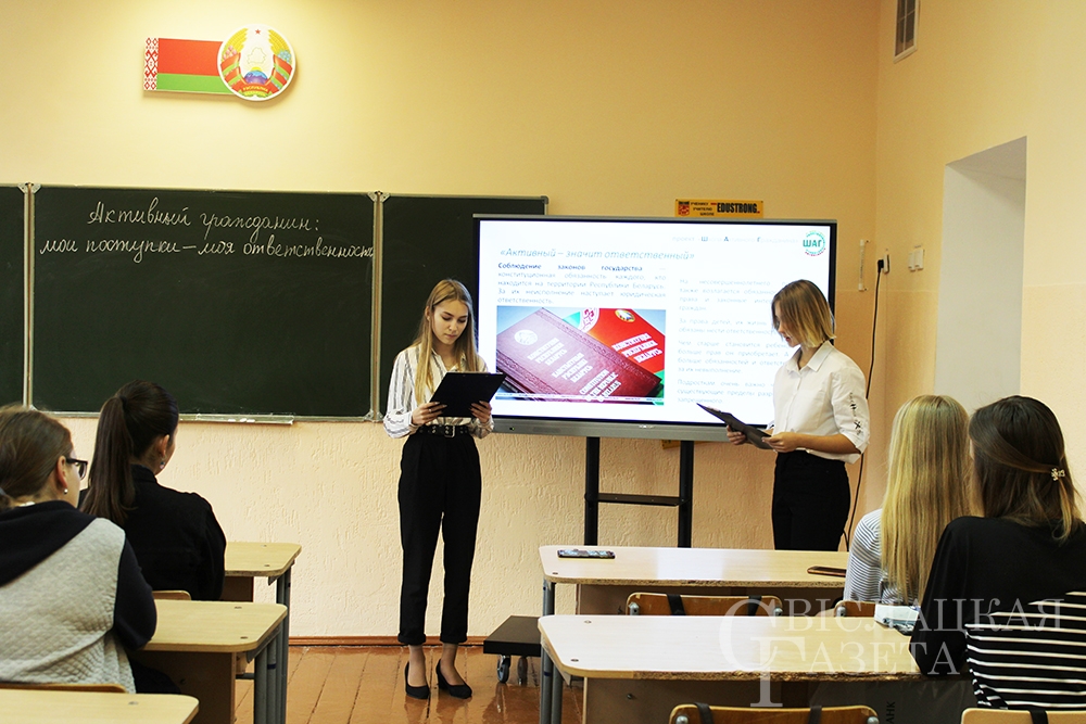 В последний четверг сентября в информационно-образовательном проекте ШАГ поучаствовали старшеклассники СШ № 2 им. Н. П. Массонова г. Свислочи. На мероприятие был приглашен инспектор ИДН Александр Рублик.