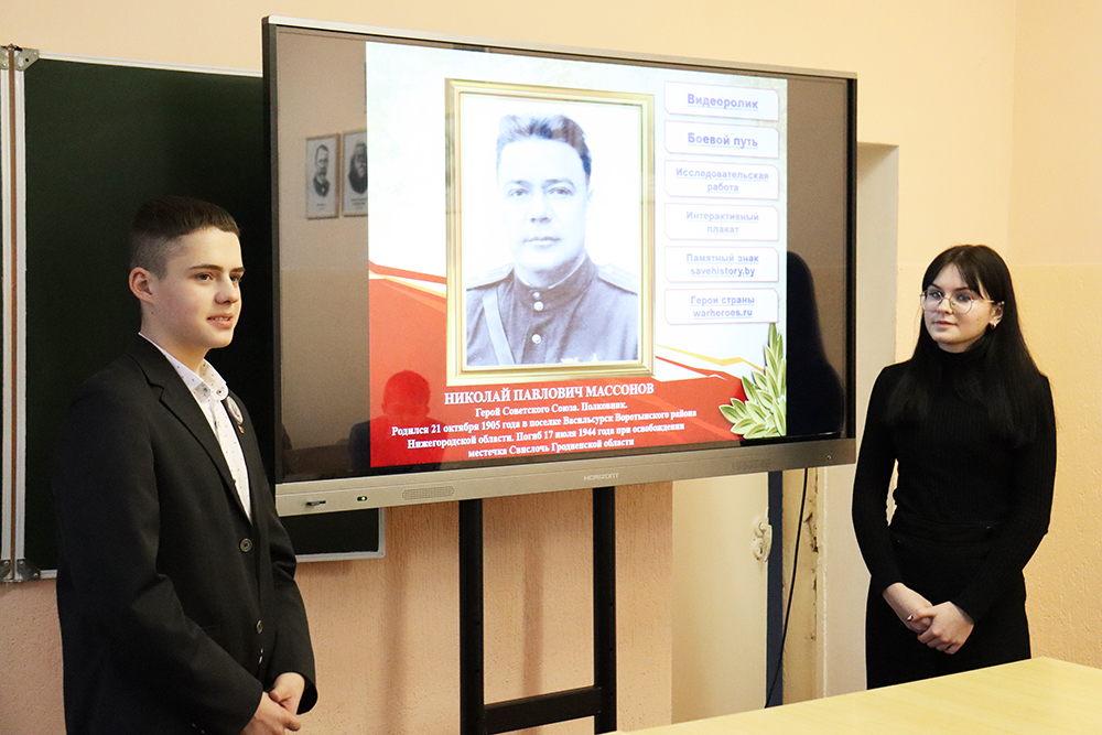 Слайды презентации содержат видеоролик о Николае Массонове, сведения о его боевом пути в годы Великой Отечественной войны со ссылкой на интерактивную карту, которая доступна всем пользователям глобальной сети (открыл – и «прошел» массоновским маршрутом «Тула – Гретня Калужской области – Курская дуга – Унеча – Гомель – Рогачев – Бобруйск – Свислочь). Здесь можно ознакомиться с исследовательской работой «Жизненный путь Героя Советского Союза Н. П. Массонова», увидеть интерактивный плакат со ссылками на дополнительные электронные источники о легендарном комдиве (в том числе и на интерактивную табличку, установленную возле памятного знака Н. П. Массонову в Свислочи). Есть и отсылка на российский патриотический интернет-ресурс «Герои страны». Словом, здесь, в презентации, можно найти многое: от «Николай Массонов родился 21 октября 1905 года в поселке Васильсурс Нижегородской области» до «в Год мира и созидания в Свислочи установят бюст полковнику, открытие памятника запланировано на 17 июля 2023 года».