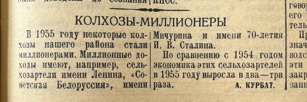 В краткой информационной публикации, всего в 12 строках, размещенной в №21 от 11 марта, говорится о том, что в 1955 году некоторые колхозы района стали миллионерами. Ее автор А. Курбат отмечает, что доходы сельхозартелей имени Ленина, «Советская Белоруссия», имени Мичурина и имени 70-летия