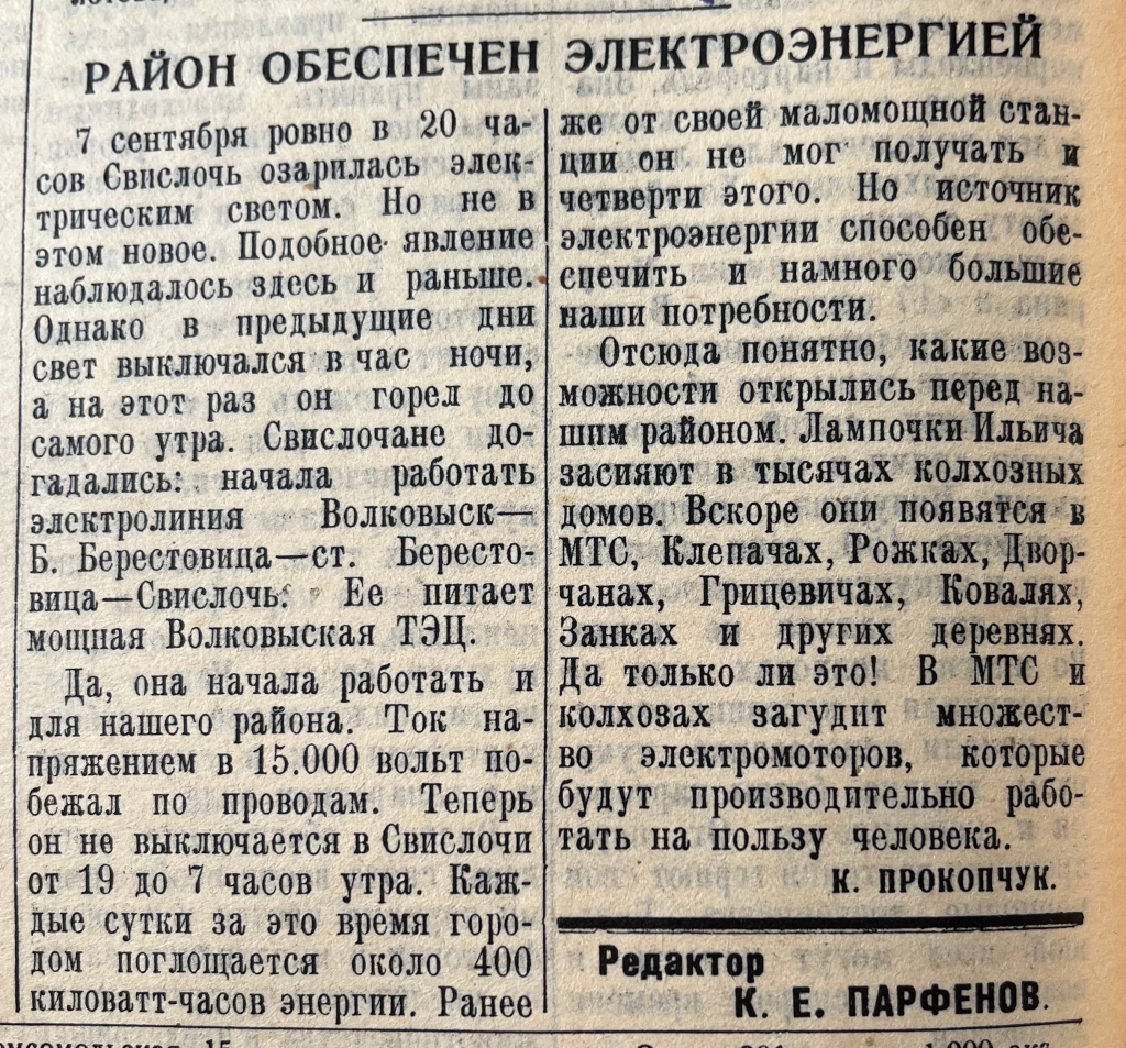 «Район обеспечен электроэнергией» – под таким заголовком вышла статья в №75 от 16 сентября. Автор К. Прокопчук рассказывает о том, как в Свислочи и районе начала работать новая электролиния. «Ток напряжением 15 000 вольт побежал по проводам. Теперь он не выключается в Свислочи от 19 до 7 часов утра. Каждые сутки за это время городом поглощается около 400 киловатт-часов энергии. Ранее же от своей маломощной станции он не мог получать и четверти этого… Лампочки Ильича засияют и в тысячах колхозных домов. Вскоре они появятся в МТС, Клепачах, Рожках, Дворчанах, Грицевичах, Ковалях, Занках и других деревнях», – говорится в статье.