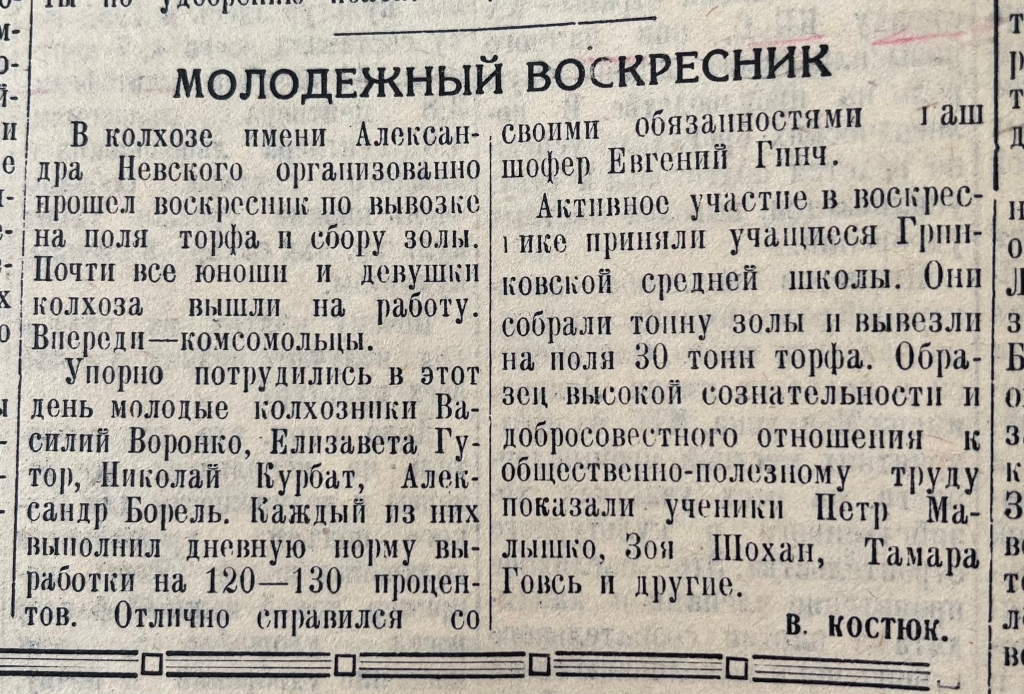 В №14 от 16 февраля опубликована статья «Молодежный воскресник», в которой говорится, как в колхозе имени Александра Невского прошел воскресник по вывозке на поля торфа и сбору золы. На эту важную работу, напрямую влияющую на будущий урожай, вышли не только молодые работники хозяйства, но и учащиеся Гринковской средней школы.