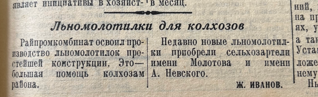Всего из трех предложений автор Ж. Иванов подготовил информацию о том, что райпромкомбинат освоил производство льномолотилок для нужд колхозов. Статья так и называется – «Льномолотилки для колхозов». В ней рассказывается, что эти устройства имеют простую конструкцию, и их приобрели уже две сельхозартели – имени Молотова и имени Невского.