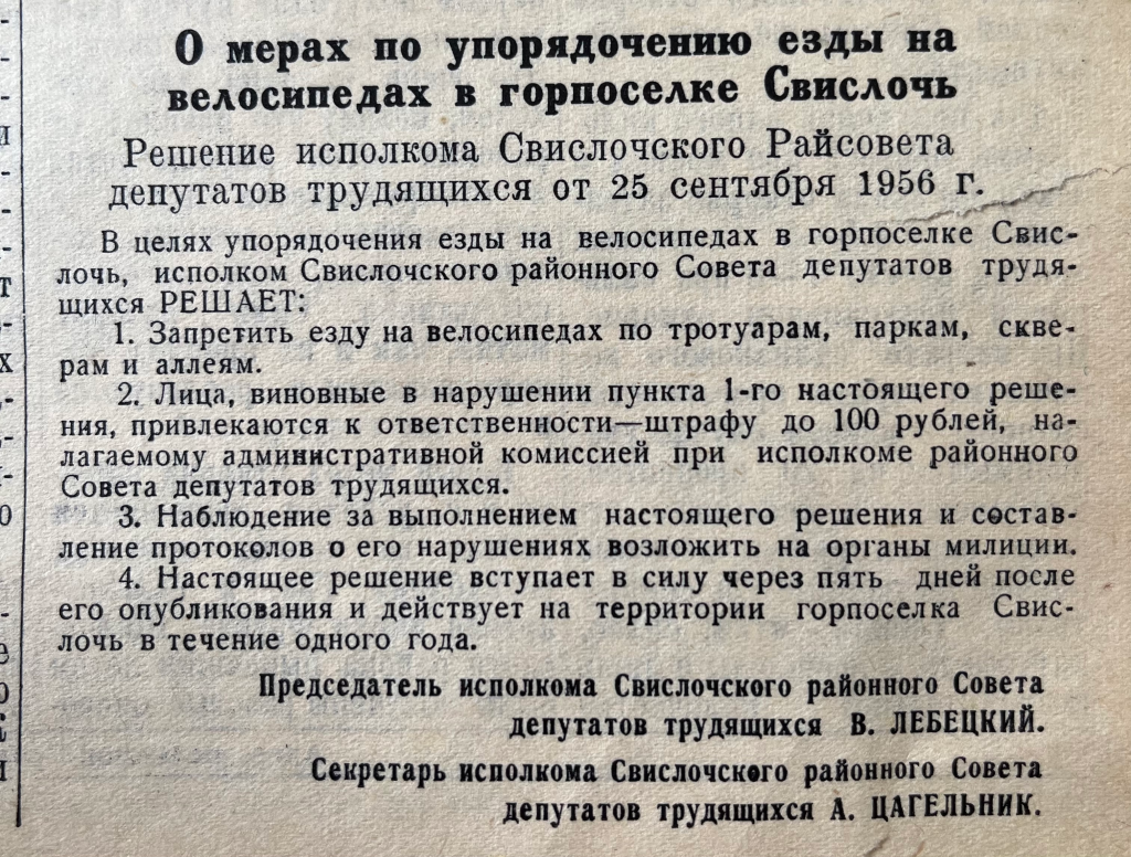 Листая подшивку 1956 года, нельзя было не обратить внимание на решение исполкома Свислочского райсовета «О мерах по упорядочению езды на велосипедах в горпоселке Свислочь». В нем говорится о запрете езды на велосипедах по тротуарам, паркам, скверам и аллеям. Нарушители привлекались к ответственности в виде штрафа. Парадокс в том, что в наше время все наоборот: чтобы избежать административной ответственности, велосипедисты должны двигаться только по тротуарам.