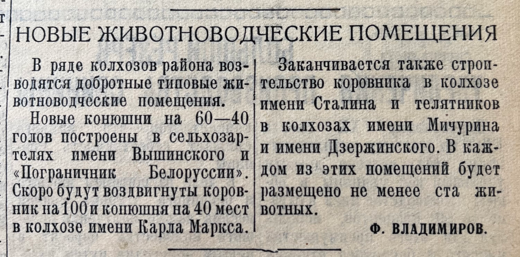В №79 от 30 сентября вышел материал под заголовком «Новые животноводческие помещения». В нем говорится о развитии животноводческой отрасли в районе. В частности, о том, что в ряде колхозов возводятся добротные типовые животноводческие помещения – новые конюшни, коровники и телятники.