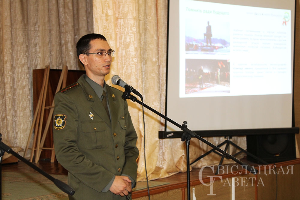 Елена Владимировна рассказала присутствующим о том, как начиналась война на Свислоччине. Уже 26 июня 1941 года на нашу землю ступили немецкие части. Они выполняли план Гитлера – уничтожить 75% белорусов, в первую очередь евреев, а 25% оставить в качестве рабов. Что было бы, если бы этот план осуществился? Нелегко было и после войны, когда пришлось восстанавливать разрушенный город. Елена Владимировна призвала молодежь беречь мир и национальные символы своего государства.