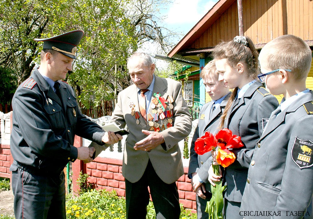 Медаль «100 год міліцыі Беларусі» пришла из Министерства внутренних дел Республики Беларусь и считается государственной наградой. Честь вручить награду уважаемому ветерану выпала заместителю начальника Свислочского РОВД Павлу Пентковскому. Поздравить Александра Михайловича пришли и ребята юридического класса второй школы райцентра.