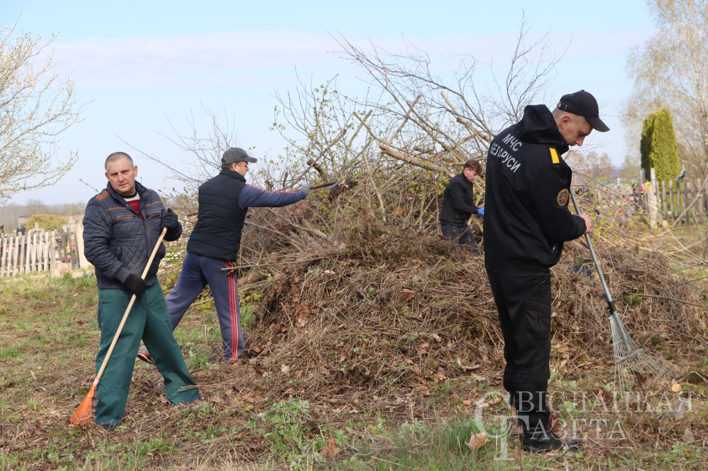 Представители разных структурных подразделений райисполкома, районного Совета депутатов, управления по труду, занятости и социальной защите райисполкома, сотрудники МЧС, электросвязи и других структур собрались вместе, чтобы очистить территорию возле православного кладбища в Свислочи. Работа здесь кипела с самого утра.