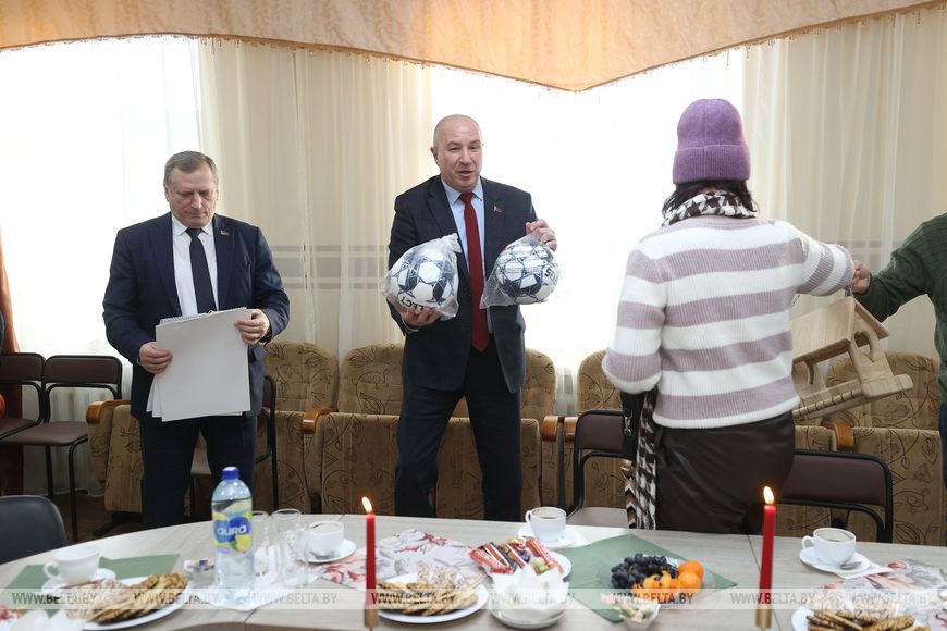 Юрий Караев и Анатолий Дорожко передали эвакуированным семьям подарки от Президентского спортивного клуба и от председателя Гродненского облисполкома Владимира Караника.
