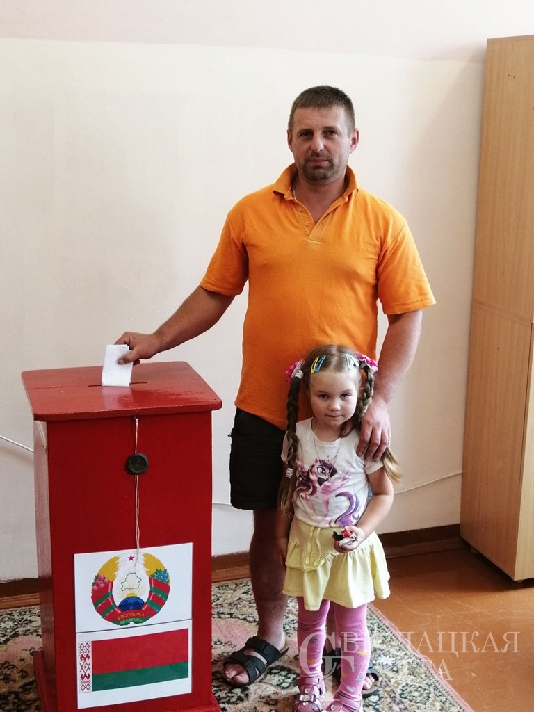 Принимают участие в досрочном голосовании приходят семьями. Отдать свой голос Александр Акудович пришел вместе с дочкой Анастасией. Ребенок с интересом следил за всей процедурой голосования, затем помог папе опустить заполненный бюллетень в урну.