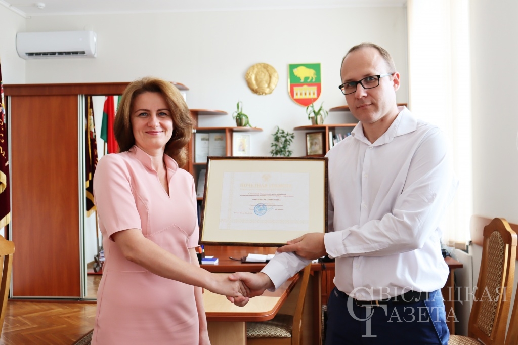 Одна из целей поездки – вручение Почетной грамоты Министерства экономики Республики Беларусь заместителю председателя райисполкома Оксане Шейко – за многолетний добросовестный труд и личный вклад в социально-экономическое развитие Свислочского района. Приказ о награждении министр Минэкономики Александр Червяков подписал 27 июня.