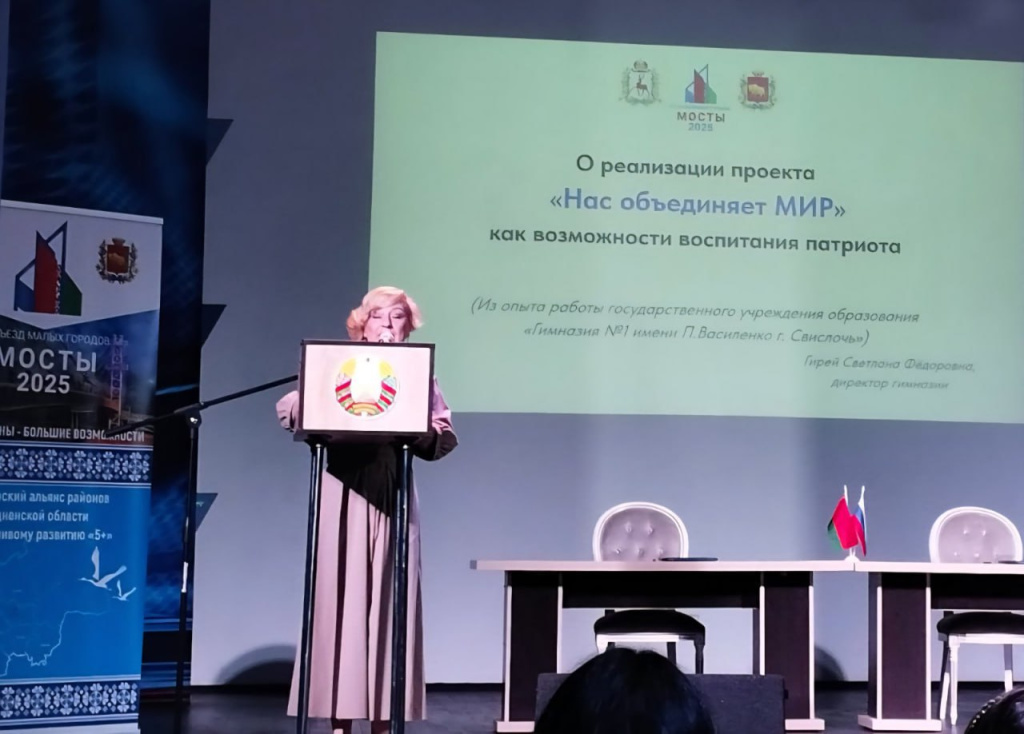Директор гимназии рассказала присутствующим о различных патриотических акциях, в которых гимназисты не только активно участвуют, но и являются их инициаторами. К примеру, по инициативе учащейся гимназии в преддверии 80-летия Победы на территории всех учреждений образования района появилась интерактивная «Скамья вечной памяти». Третий год подряд гимназисты становятся победителями республиканского конкурса «Я – патриот своей страны», что дает им право участия в белорусско-российском культурно-образовательном проекте «Поезд Памяти».