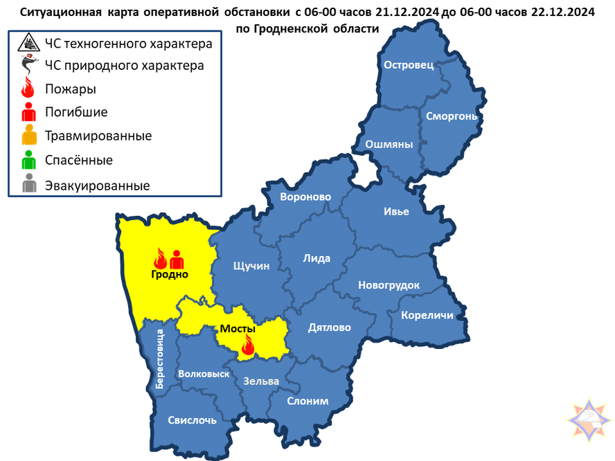 Произошло 2 пожара, погиб 1 человек: в г. Гродно – пожар в теплокамере с гибелью человека, в Мостовском районе – пожар гаража.