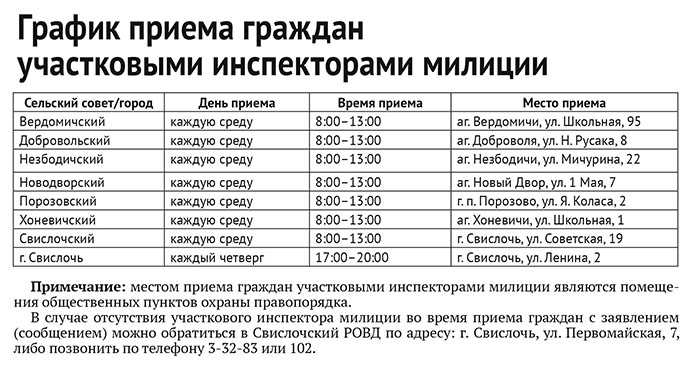 График приема граждан участковыми инспекторами милиции