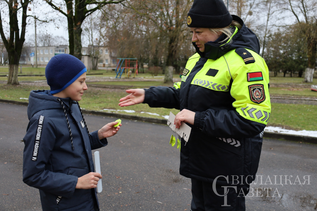 Предотвращение дорожно-транспортного травматизма с участием детей – главная цель службы ГАИ. В осенне-зимний период, когда рано темнеет и изменчивые погодные условия, важно, чтобы пешеходы обозначали себя световозвращающими элементами. Это касается как взрослых, так и маленьких пешеходов. Об этом напомнили сотрудники межрайонного отдела ГАИ Волковысского РОВД, проводя совместно со Свислочским районным комитетом ОО БРСМ профилактическую акцию, учащимся Дворчанской базовой школы.